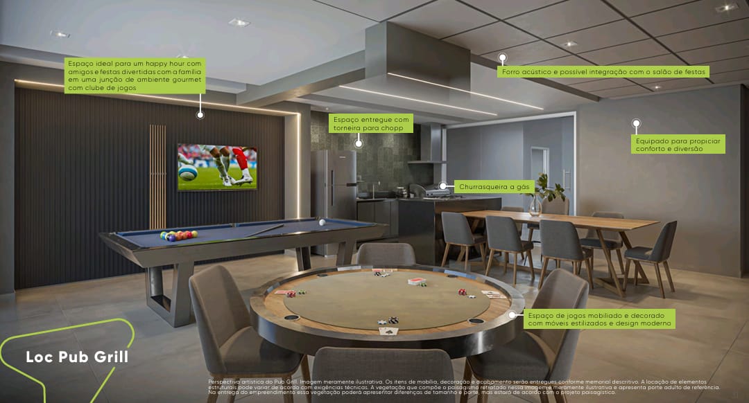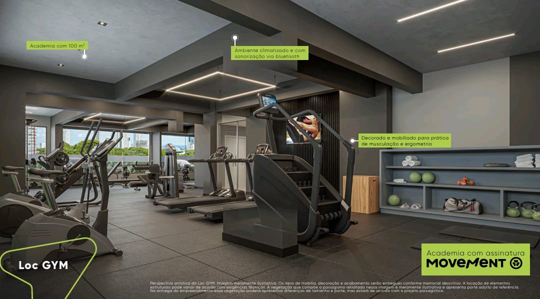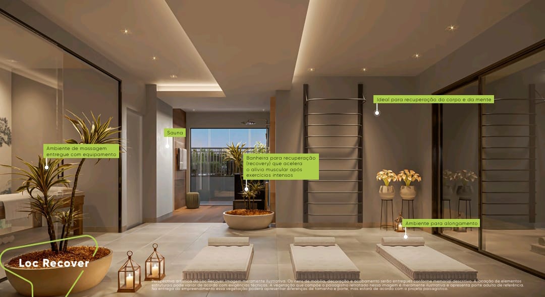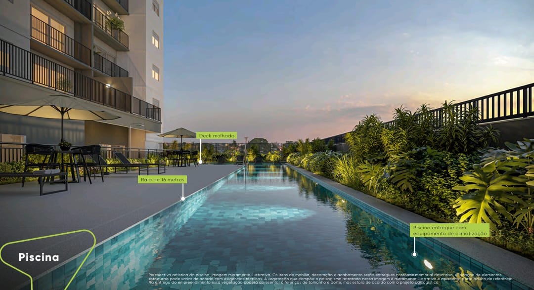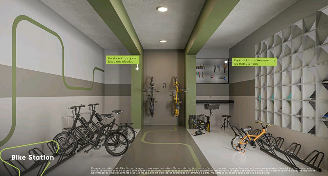 Piscina aquecida com deck seco e molhado, SPA, sala gourmet com churrasqueira, sala de jogos com churrasqueira e chopeira, salão de festas, sauna, sala de massagem, academia, pet place, coworking, studio, sala de reuniões, mini mercado, bicicletário.